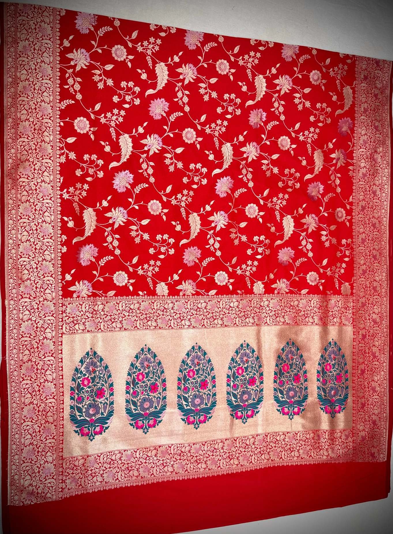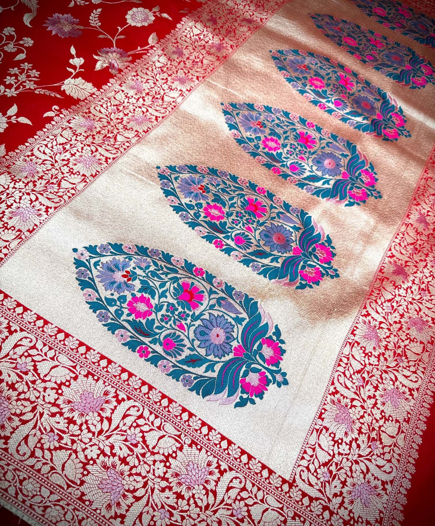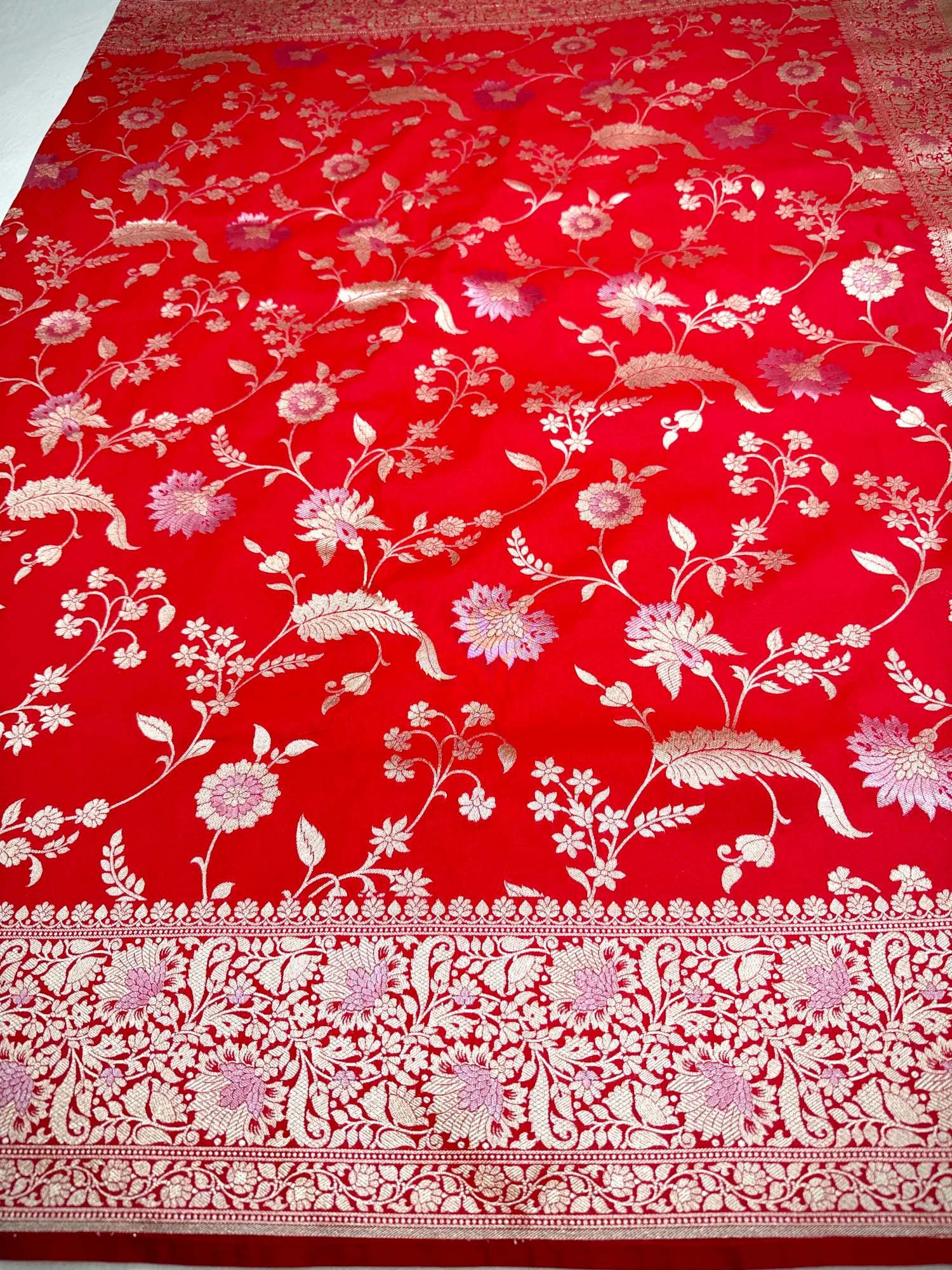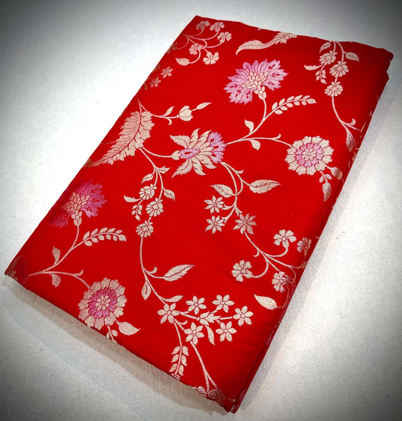 This exquisite Katan silk saree fabric features a vibrant red base enriched with intricately woven floral and vine motifs in soft gold and blush tones.