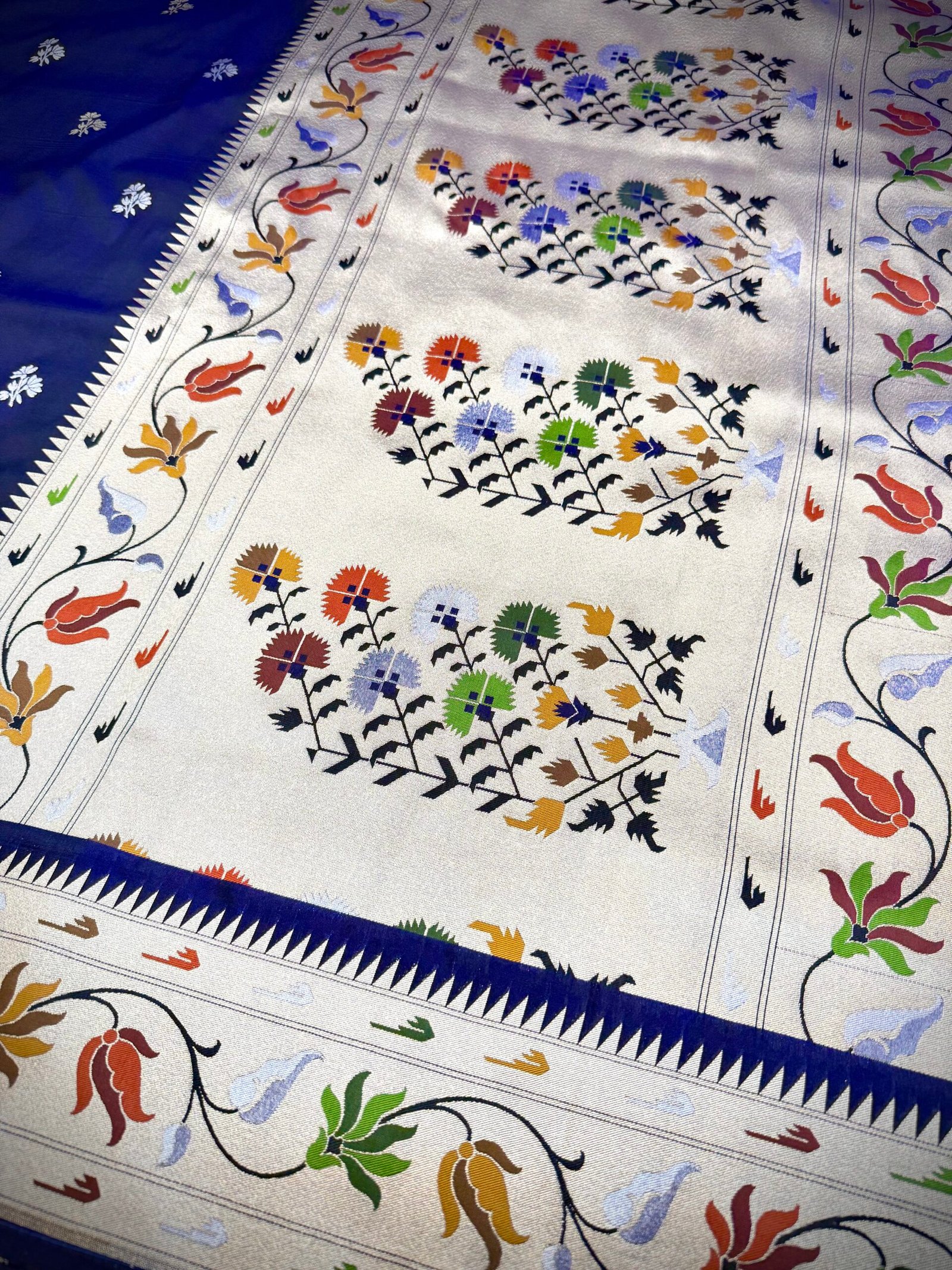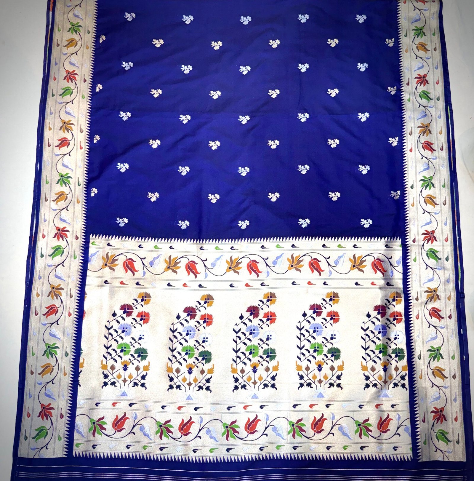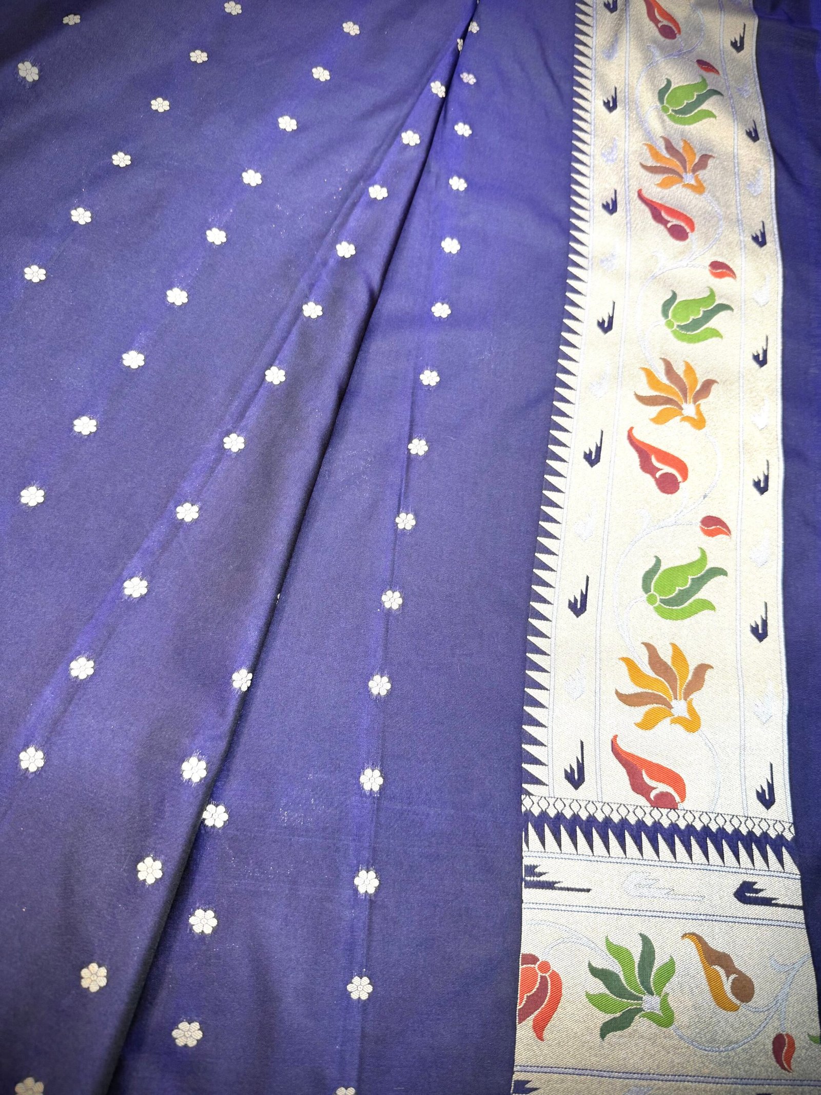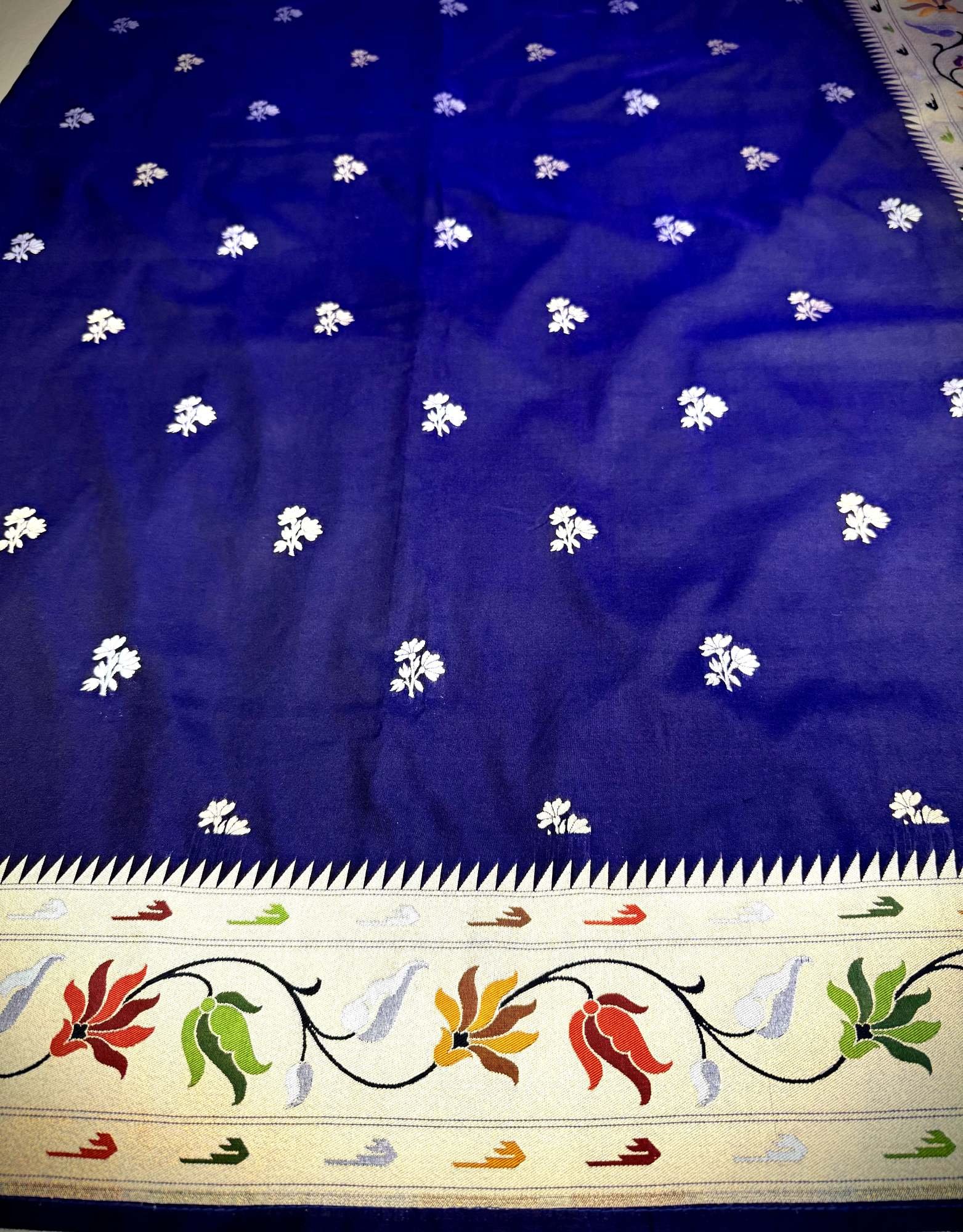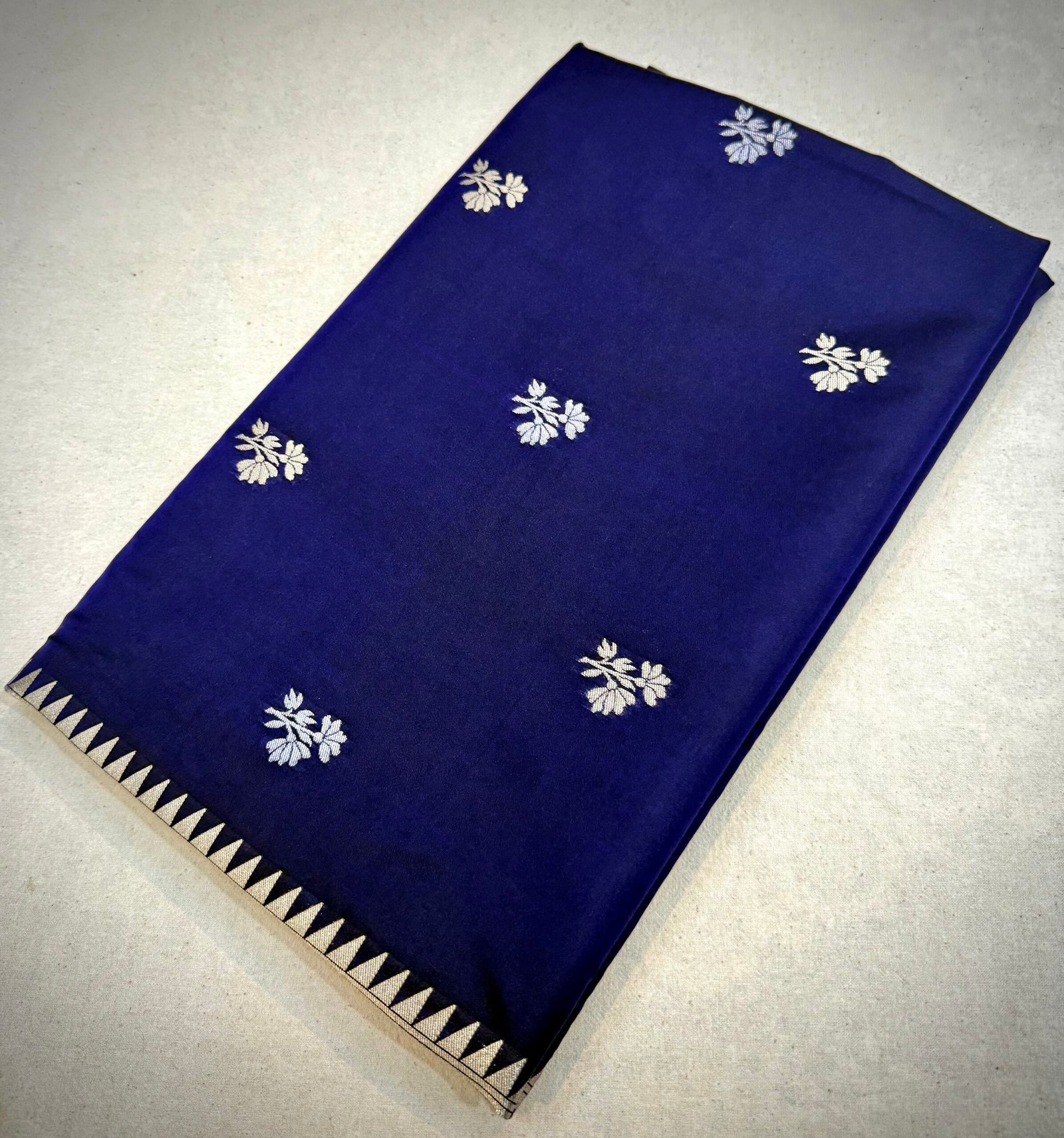 This elegant Katan silk saree features a deep navy blue base adorned with subtle small floral woven motifs in soft silver tones. The minimal and evenly spaced design gives the saree a clean, sophisticated look, while the contrast triangular-patterned border adds a refined traditional touch without overpowering the simplicity of the fabric.
