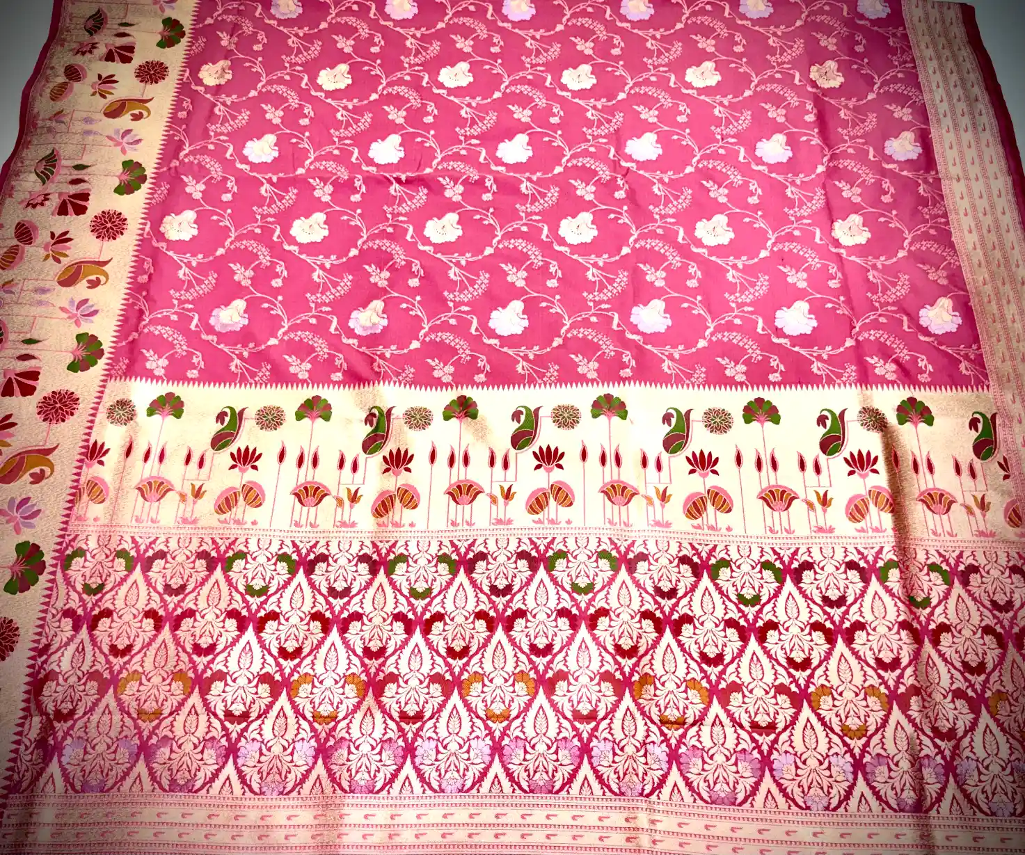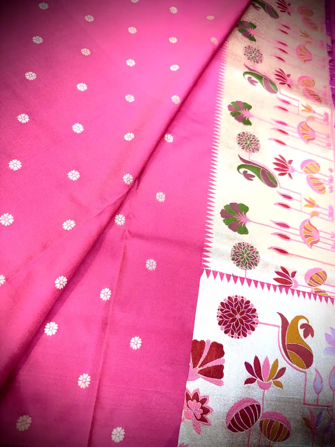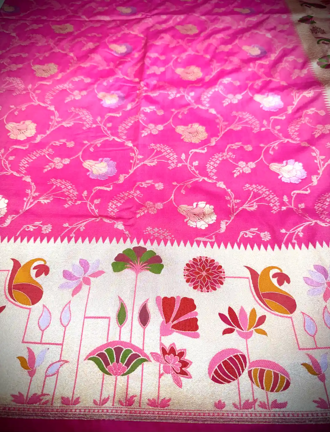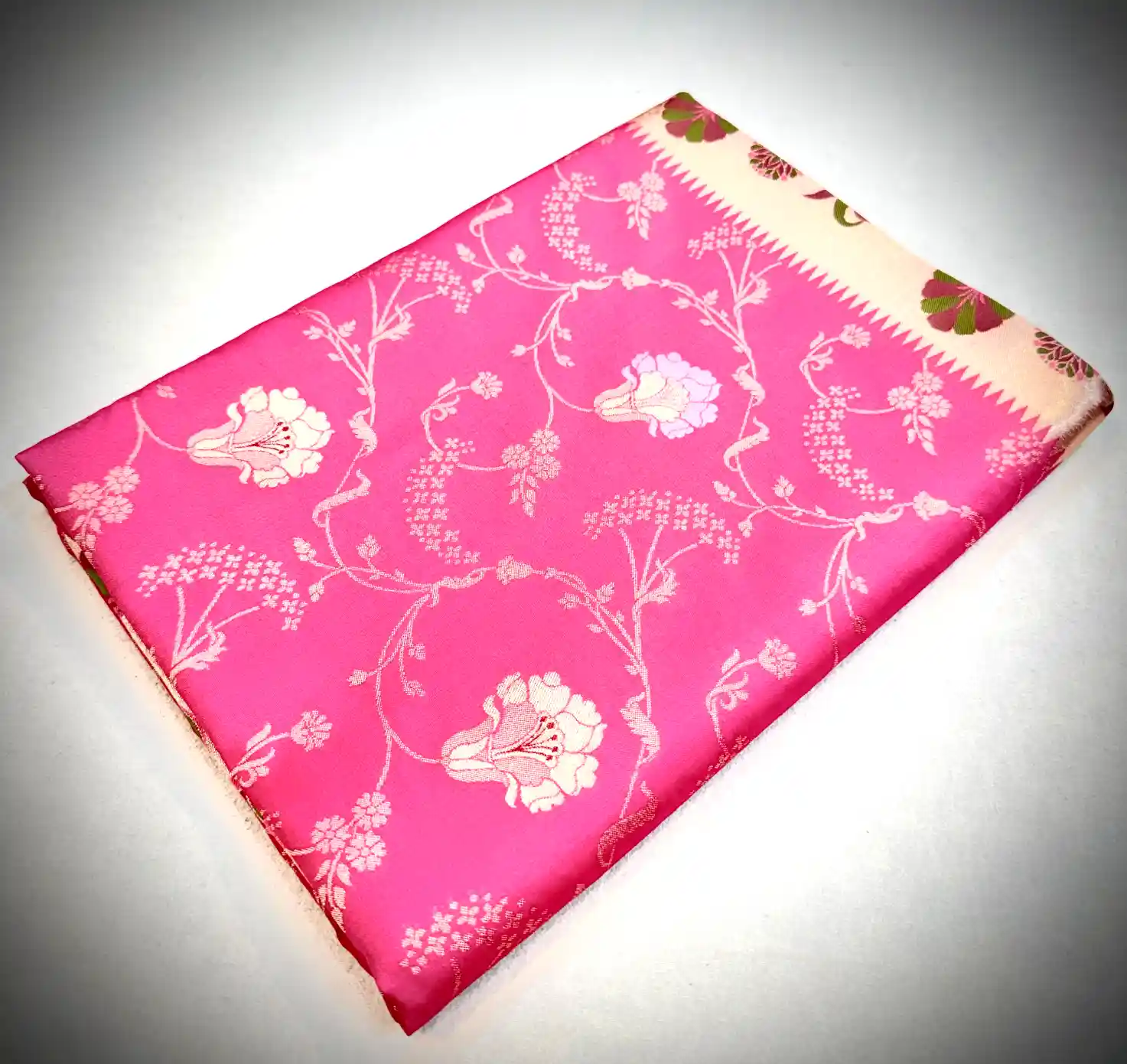 This elegant Katan silk saree features a beautiful rose pink base adorned with delicately woven floral vine motifs in soft ivory tones. The flowing all-over pattern lends the saree a graceful and feminine charm, while the subtle contrast decorative border enhances its traditional appeal without overpowering the design.