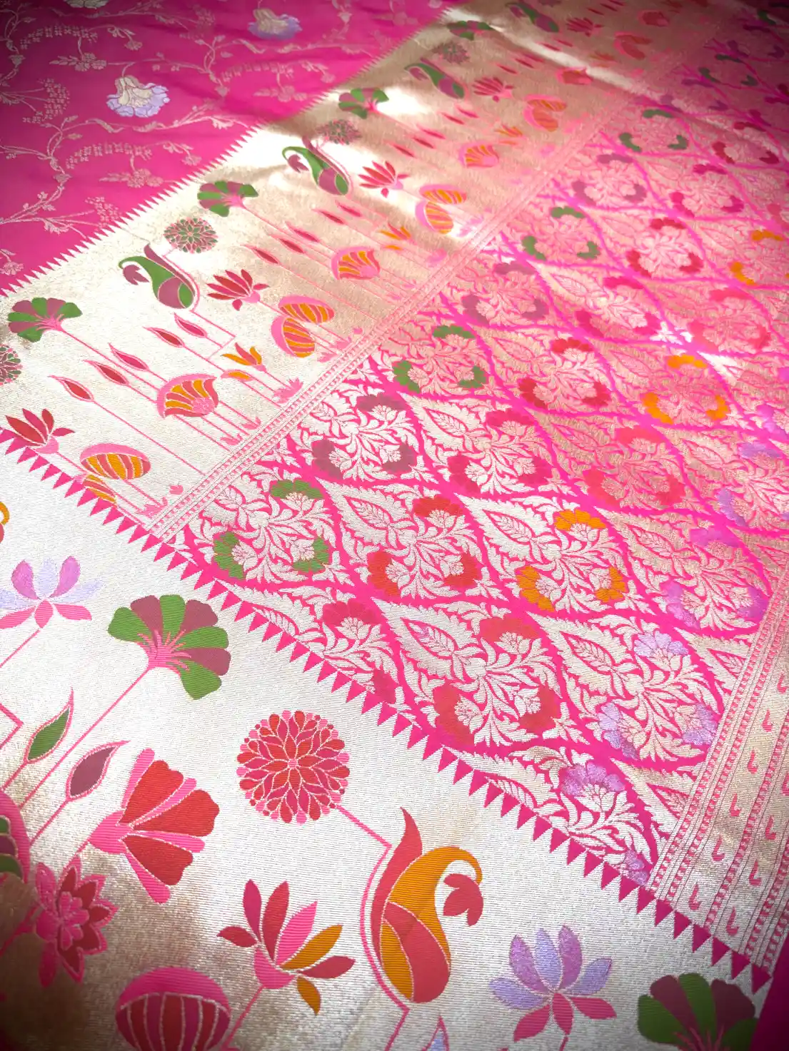 Crafted from premium Katan silk, the fabric is known for its smooth texture, durability, and refined natural sheen. The saree drapes effortlessly while maintaining a structured silhouette, making it an ideal choice for festive celebrations, wedding functions, cultural events, and traditional occasions.