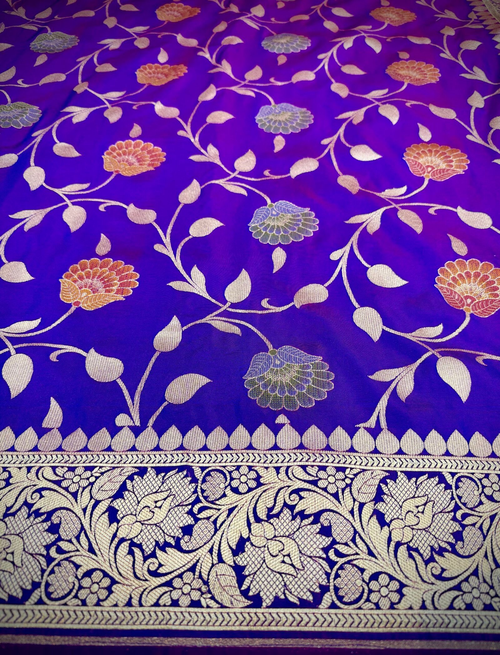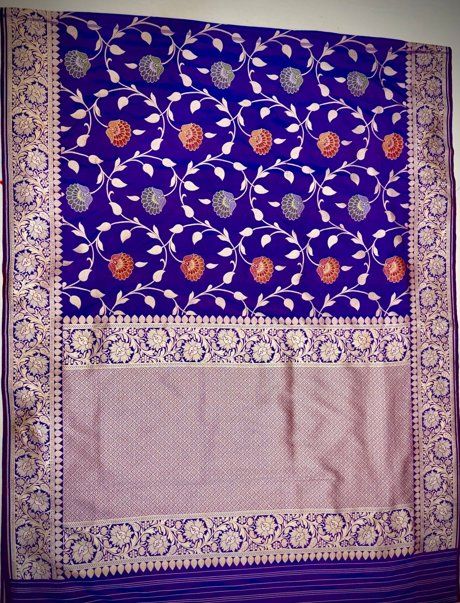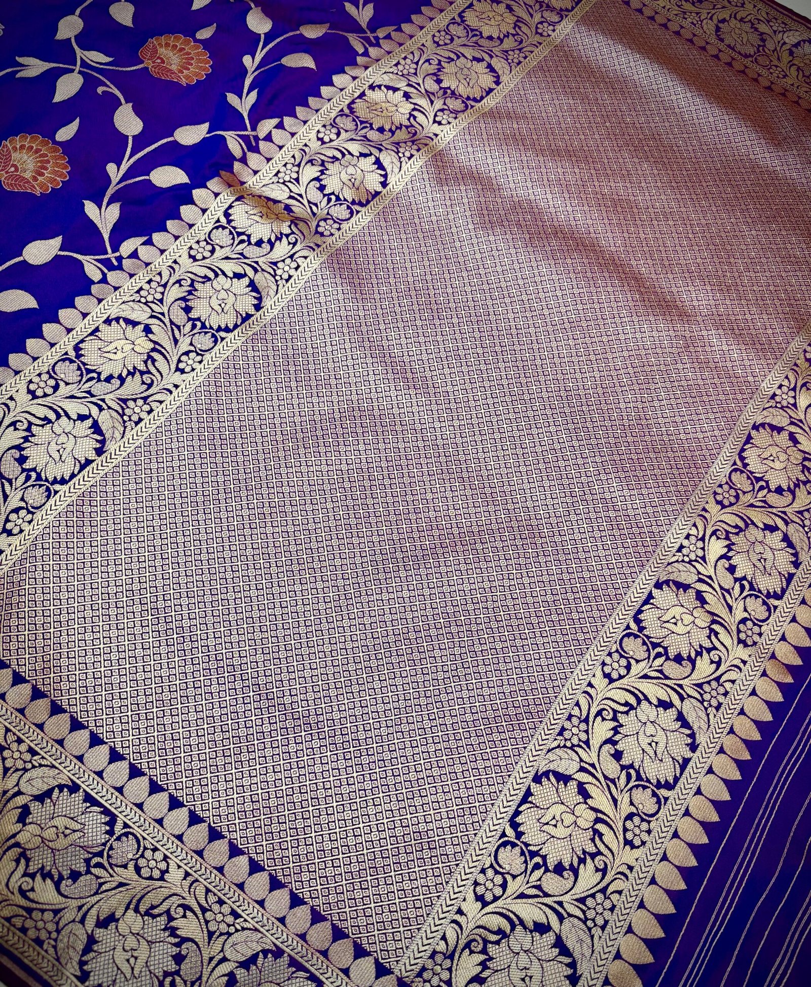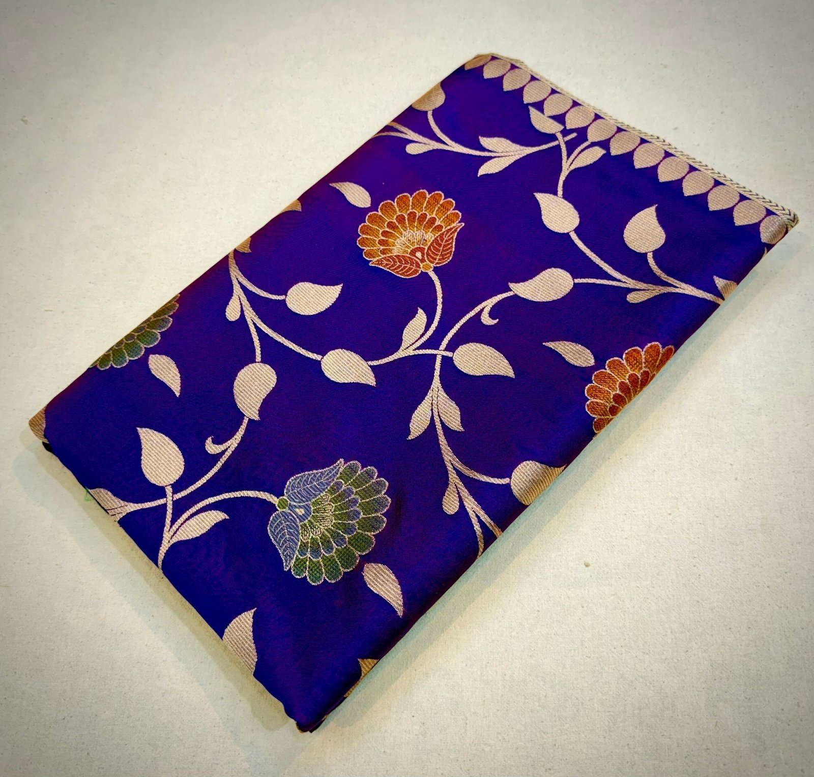 Experience timeless elegance with this premium Katan Silk Saree, crafted to reflect traditional artistry and luxurious appeal. Featuring a rich royal blue base, this saree is beautifully adorned with woven floral vine motifs in contrasting shades of gold, orange, and green, giving it a refined and regal character. The intricate zari-style detailing enhances its richness while maintaining a balanced and graceful look.